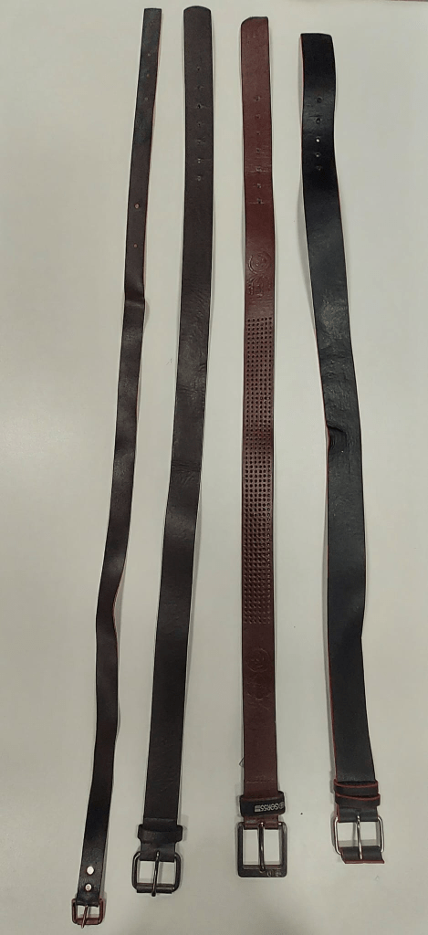 The two belts on the left will be worn by Jimmy (Ruben Martin), one to keep his pants up and the other to fight with. The brown belt in the middle right will be worn by Thomas (Alex Morgan) and will not be used for fighting. Lastly the belt on the far right will be worn by Sean (Nicolas Forstman) and used to fight with many times. (These bets will be kept on us at all times)