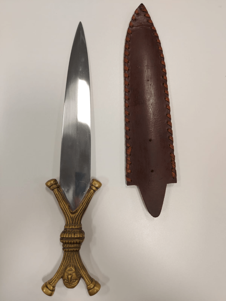 The short sword will be kept on the props table on Stage left.