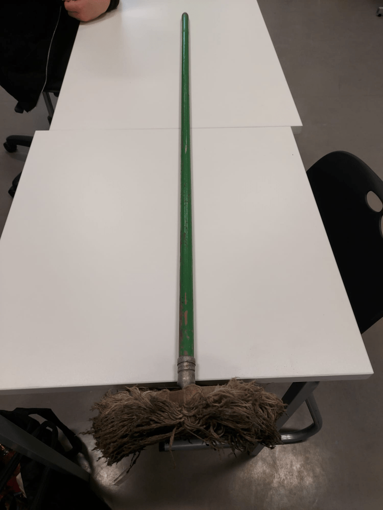 The mop is used by Margret in scene 11 in the dispensary for cleaning the floor