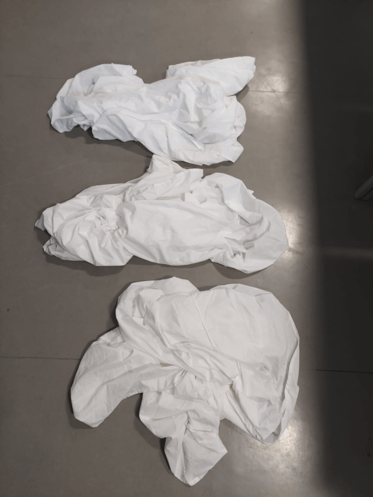 There are 3 clean white blankets that will be used in the infirmary scene 11. They are held and used by Nick, Ruben, and Alex Morgan.