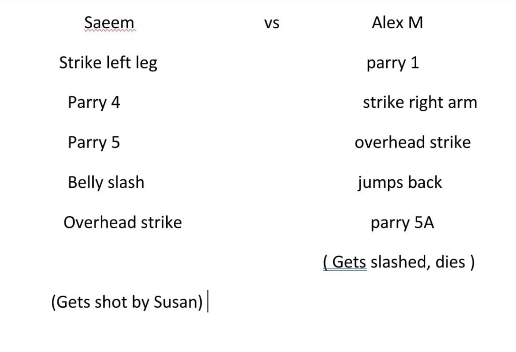 That is Saeem’s and Alex Morgan’s Fight sequence, and the first fight we will be showing off in our battle scene. The process of making this fight was rather simple and straight forward because both Saeem and Alex have had some past experience with staged combat so they already knew the basics and the etiquette for a staged combat rehearsal. They did not mess about and got straight into it. I had to demonstrate how to do certain moves and teach them the proper way to use the words to get that metal on metal sound you hear.