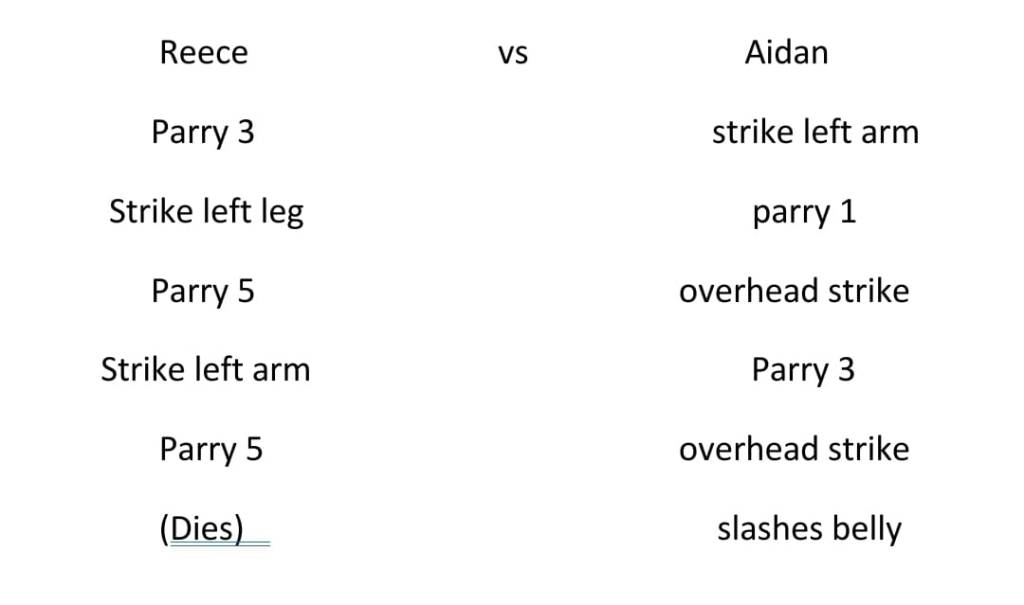 Reece and Aidan’s Fight sequence took some time to choreograph however we got there in the end, it’s still not perfect and there is definitely room to improve however its a very solid start. Since only Reece had a little bit of staged combat experience in the past I had to still help them both out with their moves and parry’s. They were quite unfocused and unorganized at first however I managed to get them to focus up and work a bit harder.